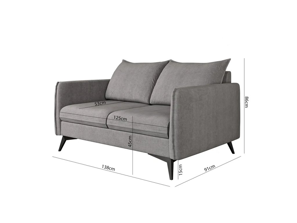 Barva Šedá Velikost pohovky Dvoumístná Roh a tvar Rovná Šířka 138 cm Výška 86 cm Hloubka 91 cm Váha 35 kg Nosnost 250 kg Výška nohou 15 cm Výška sedáku 45 cm Hloubka sedáku 53 cm Šířka sedáku 125 cm Výška zadní opěrky 41 cm Výška područky 67 cm Šířka područky 9.5 cm Materiál čalounění Látka Martindale 45000 martindale Specifikace materiálu 100% polyester Materiál konstrukce Dřevotříska, překližka Materiál nohou Kov Barva nohou Černá Výplň Molitan (PUR), pružiny Tvrdost sedáku Středně tvrdý Péče Čistit suchým hadřikem, nepouživat agresivní a abrazivní čističe Sedací polštáře Na pevno Zádové polštáře Odnímatelné