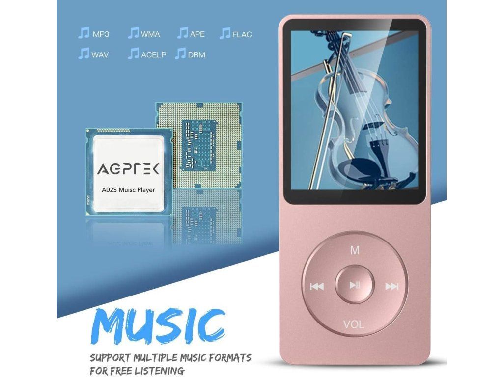 AGPTEK A02 je lehký a výkonný MP3 přehrávač pro sport i každodenní poslech: dlouhá výdrž baterie, čistý zvuk ve více formátech a praktické funkce jako FM rádio a diktovací zařízení.