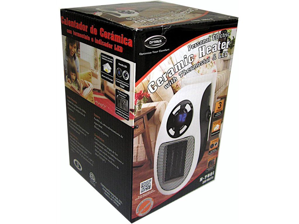 Obsah balení: přístroj Optimus H-7801 a návod k použití. Technické údaje: napájení elektrické, výkon 450 W, rozsah nastavení 60–90 °F (cca 16–32 °C), doporučené krytí prostoru cca 90 ft² (přibližně 8 m²), hmotnost cca 0,45 kg, model H-7801, záruka 90 dní.