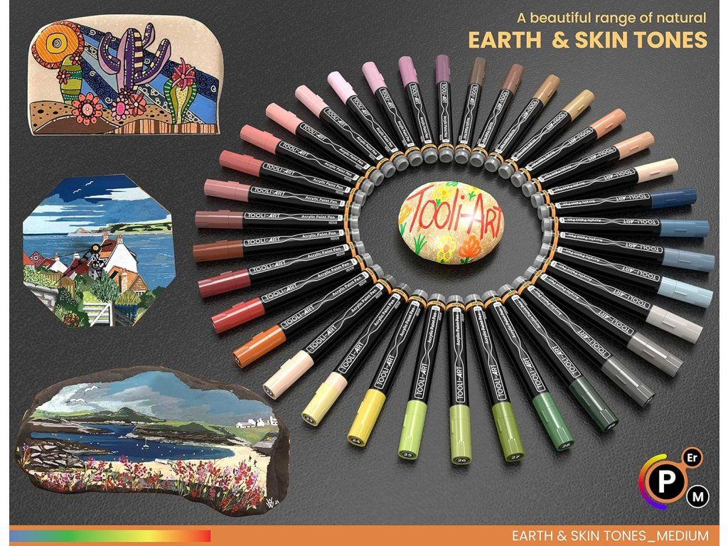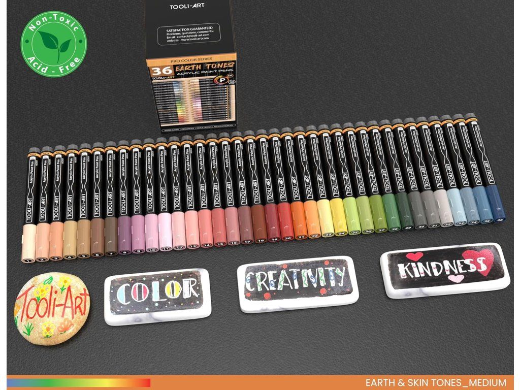 Sada 36 akrylových popisovačů TOOLI-ART v přirozených odstínech pleti a zemitých tónů je navržena pro detailní malbu tváří, postav, zvířat i přírodních motivů. Vysoce pigmentované, rychleschnoucí barvy poskytují neprůhledné krytí a snadné použití na široké škále povrchů.