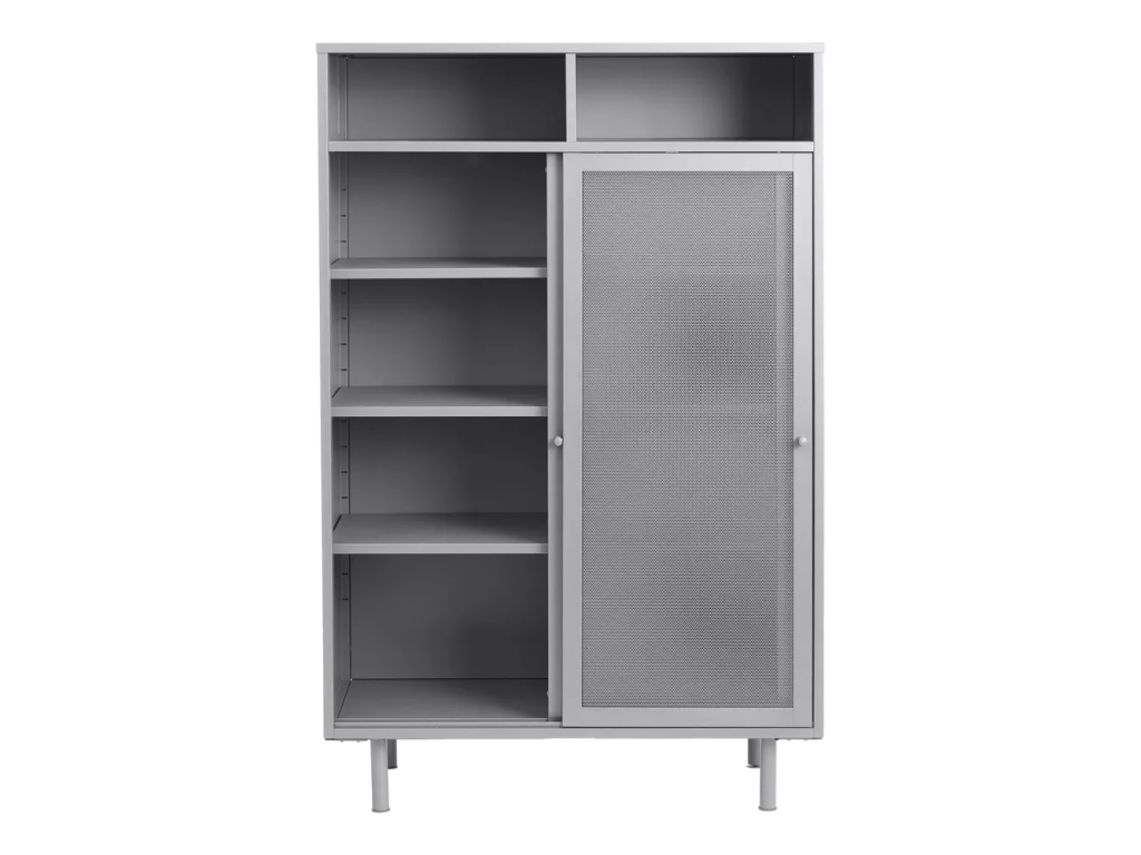 Barva Šedá Šířka 90 cm Výška 140 cm Hloubka 40 cm Váha 34 kg Nosnost 80 kg Výška nohou 14 cm Materiál Kov Vlastnosti S posuvnými dveřmi, s poličkami, nastavitelná výška polic, na nožičkách Péče Čistit suchým hadřikem, nepouživat agresivní a abrazivní čističe Systém zavírání Bez tlumeníDoplňkové parametry