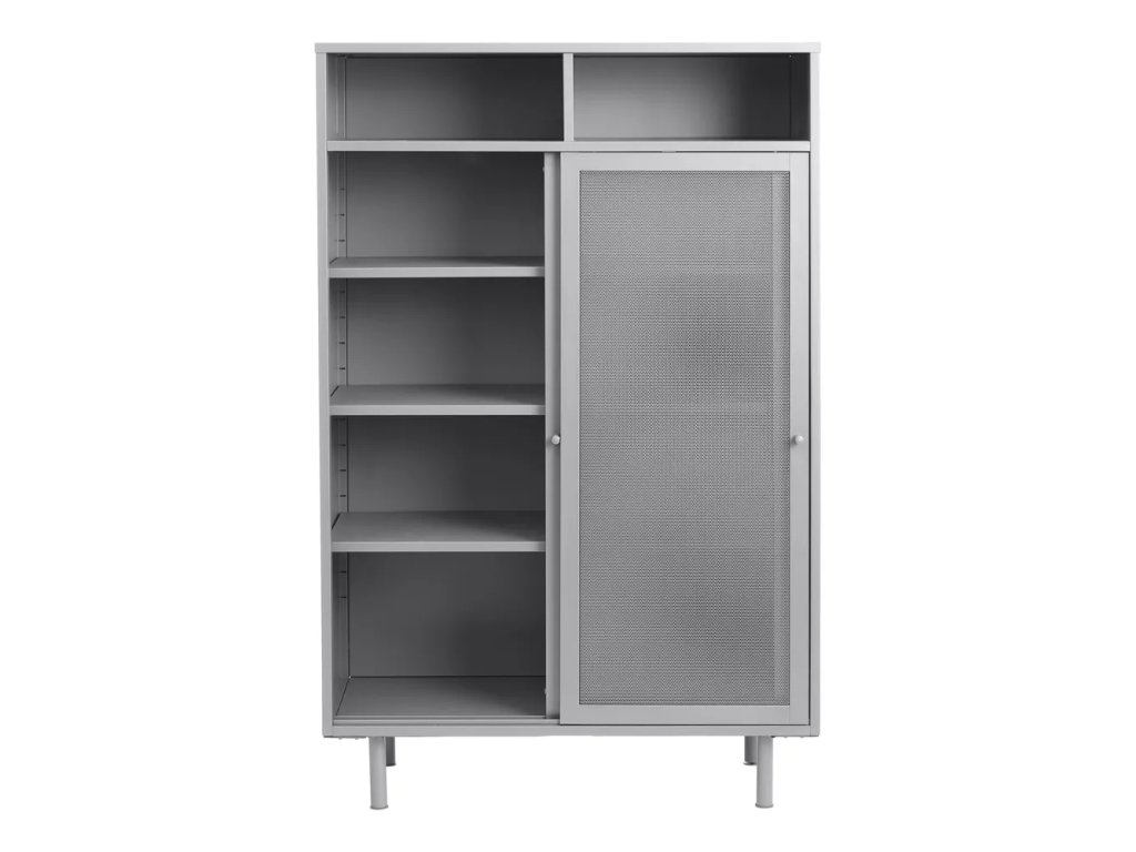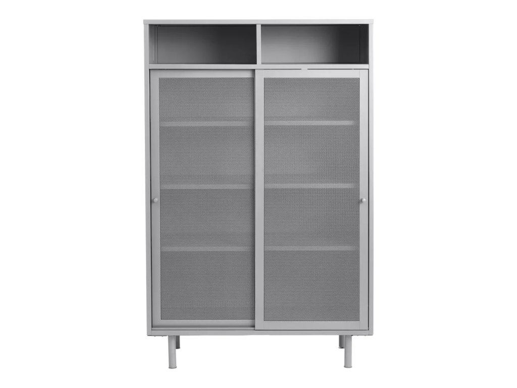 Barva SVĚTLE BÉŽOVÁ Šířka 90 cm Výška 140 cm Hloubka 40 cm Váha 34 kg Nosnost 80 kg Výška nohou 14 cm Materiál Kov Vlastnosti S posuvnými dveřmi, s poličkami, nastavitelná výška polic, na nožičkách Péče Čistit suchým hadřikem, nepouživat agresivní a abrazivní čističe Systém zavírání Bez tlumení