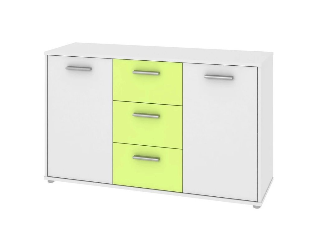 Materiál: dřevotříska, kov, plast dekor korpus: bílý mat dekor přední plochy: bílý mat/limetkově zelený mat vodorovné úchyty (šedá alu barva) přízemní kluzáky (šedá alu barva) 1 levé dveře: uvnitř úložný prostor, 1 dřevěná police (doporučená nosnost do 5 kg, výškově nastavitelná) 3 zásuvky uprostřed (kovové pojezdy) 1 pravé dveře: uvnitř úložný prostor, 1 dřevěná police (doporučená nosnost do 5 kg, výškově nastavitelná) český výrobek dodáváno v demontu