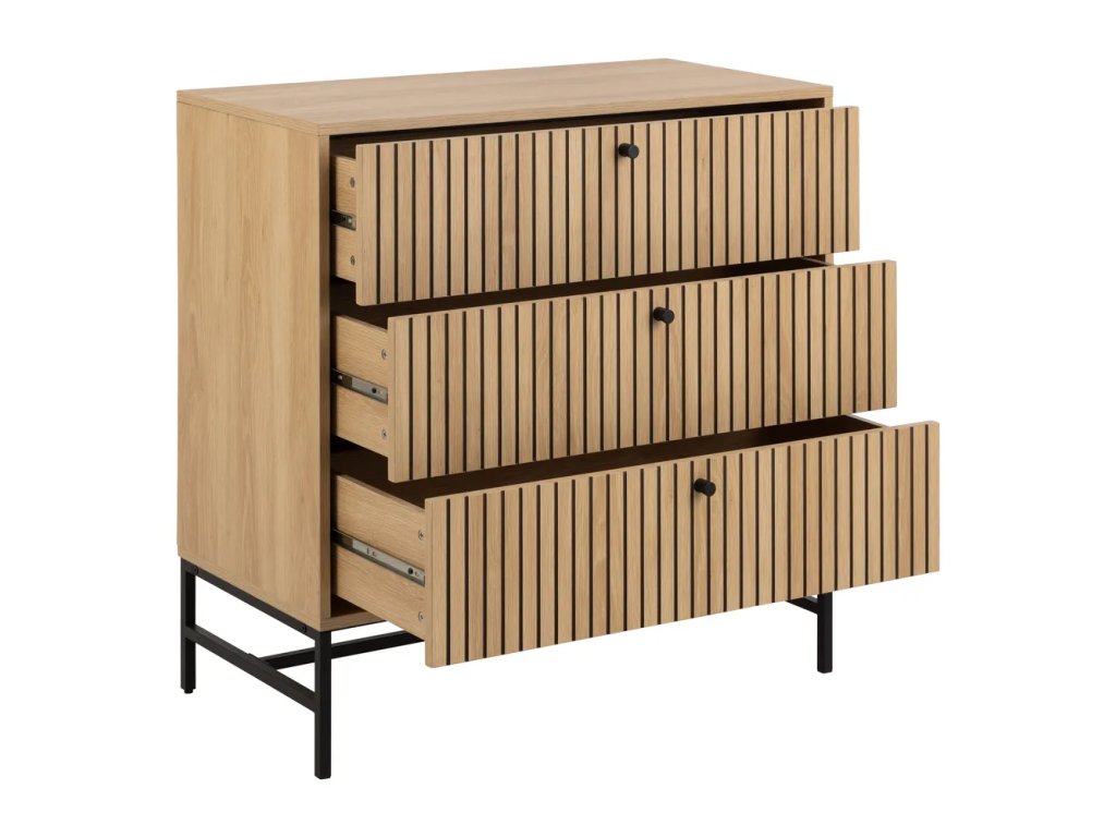 Komoda Albany v dekoru dubu má moderní lamelové čelo a tři zásuvky, které poskytují velkorysý úložný prostor. Černá práškově lakovaná základna je vyrobena z oceli a perfektně ladí s minimalistickými černými úchytkami. Certifikát FSC™ dokládá, že komoda vznikla v souladu se zásadami udržitelného lesního hospodářství. Barva Přírodní Šířka 80.6 cm Výška 80.4 cm Hloubka 40 cm Váha 28.8 kg Nosnost 15 kg Výška nohou 18 cm Materiál MDF Dekor Dub, matný Barva dřeva Světlé dřevo Povrchová úprava Melamin Materiál nohou Ocel Barva nohou Černá Vlastnosti Se šuplíky, na nožičkách Péče Čistit vlhkým hadříkem nebo houbičkou, nepouživat agresivní a abrazivní čističe