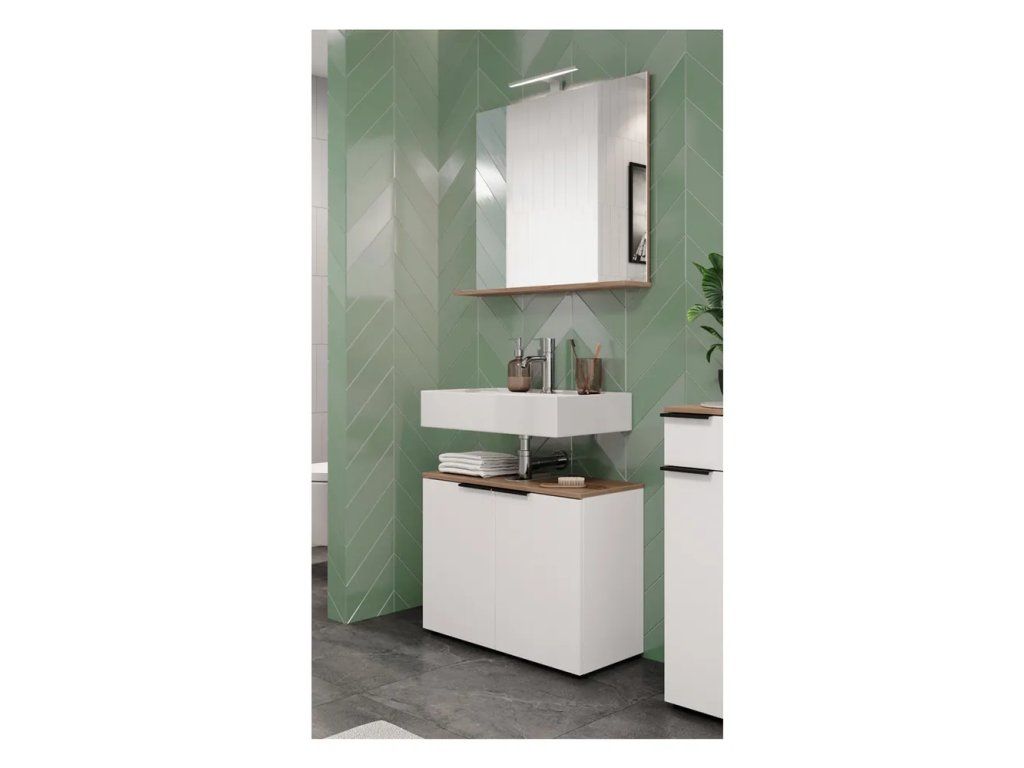 Jak napovídá samotný název, nábytek značky Germania je vyráběn výhradně v Německu, což mu zaručuje velmi kvalitní zpracování. Koupelnová sestava Menen disponuje praktickým zrcadlem s poličkou a integrovaným LED osvětlením a skříňkou na umyvadlo. To vše v odolné melaminové povrchové úpravě s ABS hranami.Barva Bílá Materiál Dřevotříska Dekor Dub Barva dřeva Karamelové dřevo Povrchová úprava Melamin Vlastnosti S dvířky, se zrcadlem, s poličkami Péče Čistit vlhkým hadříkem nebo houbičkou, nepouživat agresivní a abrazivní čističe Typ Se zrcadlem, bez umyvadla, bez baterie, s osvětlením