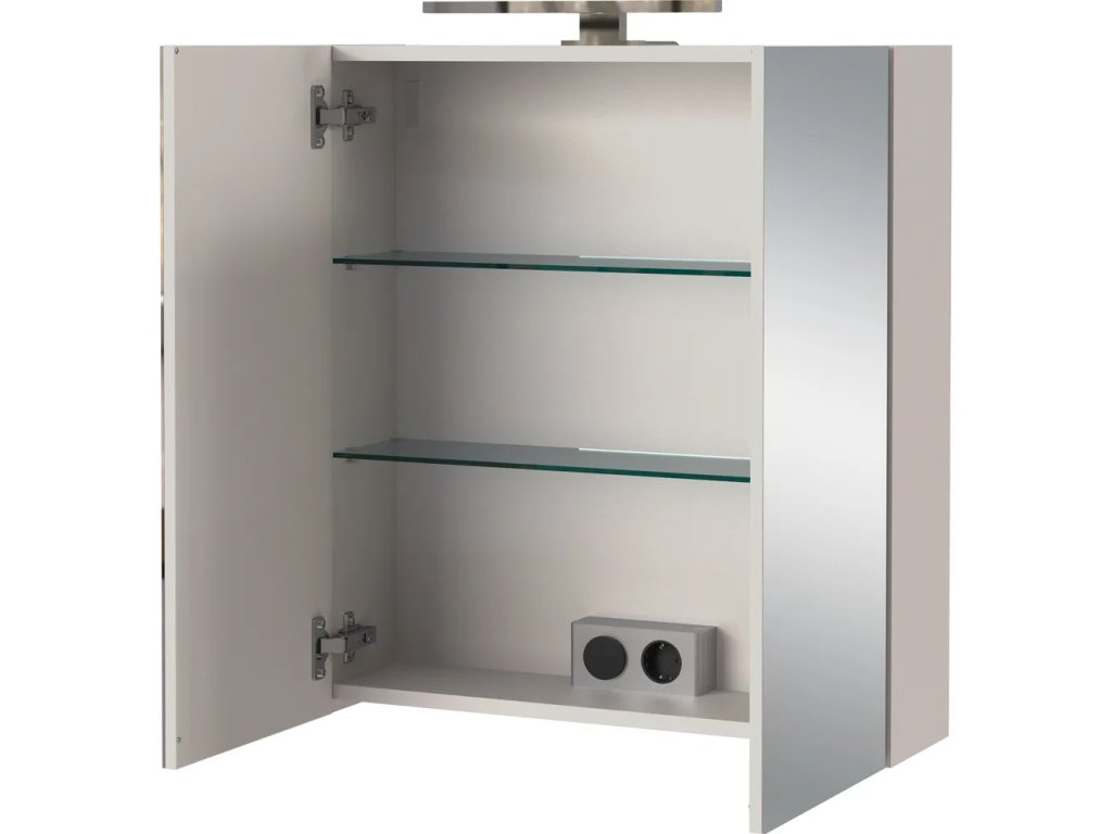 Skříňka je vybavena dvěma skleněnými policemi s nosností do 1 kg a spodní policí s nosností do 10 kg. Uprostřed se nachází zásuvka a vypínač světla. Součástí je LED osvětlení o rozměrech 30 x 5 x 9,5 cm s neutrálním bílým světlem.