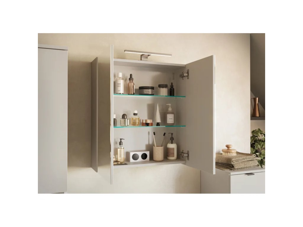 Barva Krémová Šířka 60 cm Výška 71 cm Hloubka 23 cm Váha 14.4 kg Nosnost 12 kg Materiál MDF Povrchová úprava Melamin Materiál poliček Sklo Vlastnosti S dvířky, se zrcadlem, s poličkami, závěsné, s osvětlením Péče Čistit suchým hadřikem, nepouživat agresivní a abrazivní čističe Systém zavírání Soft close (tiché dovírání) Typ Závěsná, se zrcadlem, nad umyvadlo