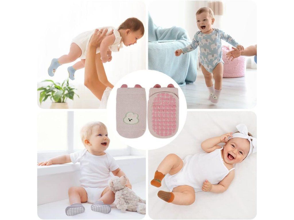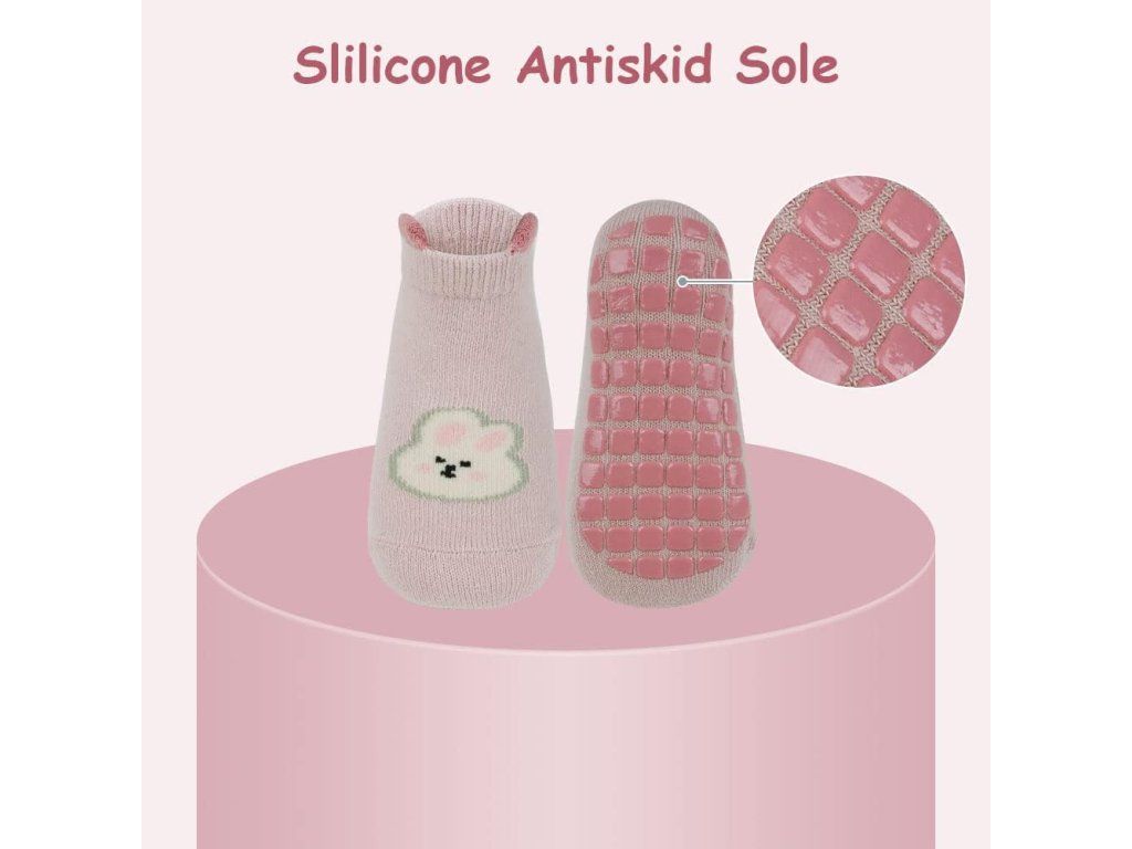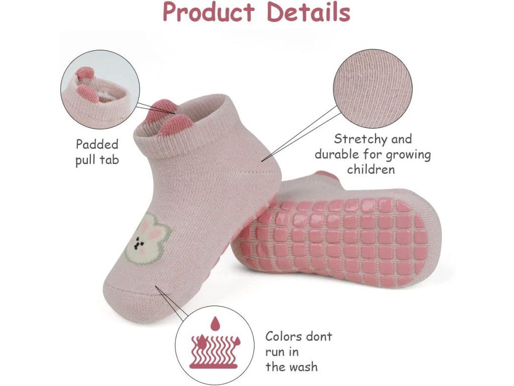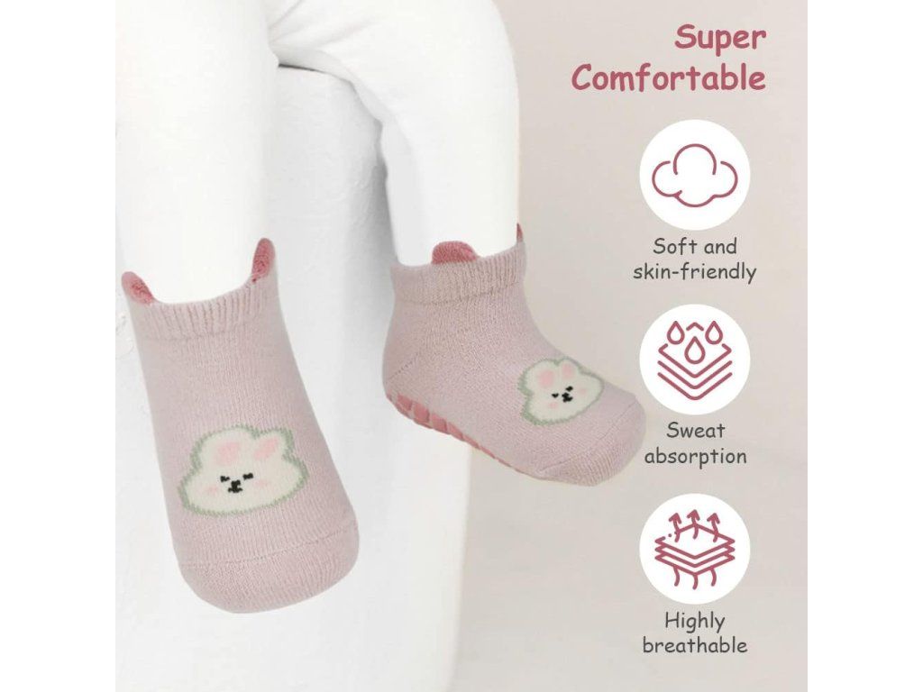 Komfortní a pevné dětské ponožky navržené pro citlivou pokožku i aktivní pohyb – savý bavlněný materiál zvyšuje prodyšnost, zatímco silikonové bodky na podrážce zabraňují uklouznutí při lezení a prvních krocích.