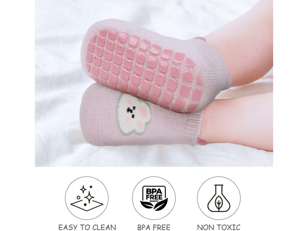 - Protiskluz: Silikonové tečky na spodní straně pro lepší přilnavost na hladkých površích, vhodné při učení chůze a lezení.
