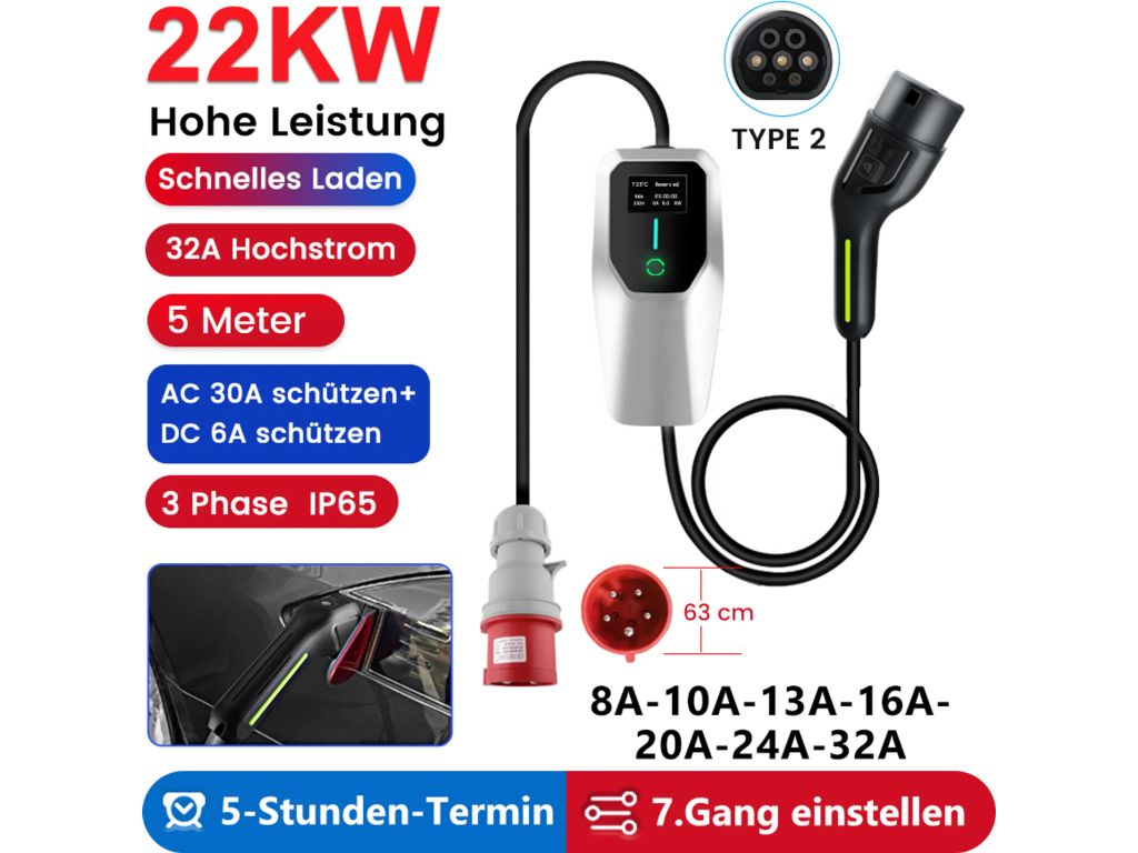 Přenosná nabíječka pro elektromobil Type 2 5m 22KW Nové