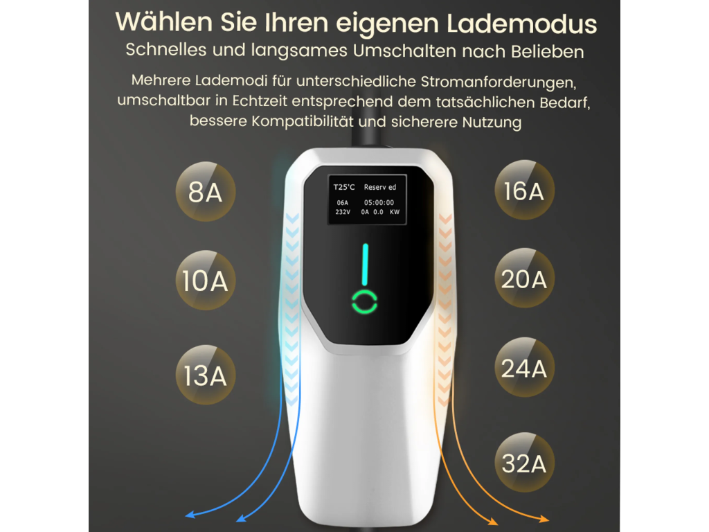 Volitelný nabíjecí proud: 6A / 8A / 10A / 13A / 16A / 20A / 24A / 32A