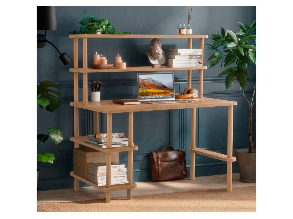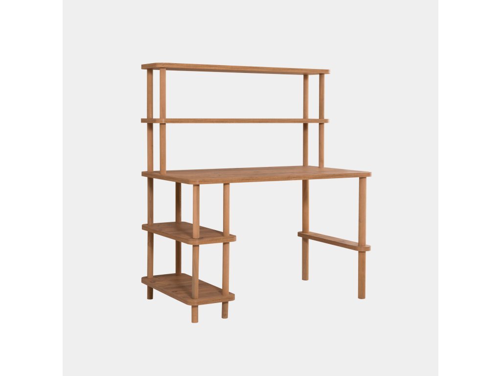Design stolu působí vzdušně a čistě, dekor dřeva borovice atlantic se bude dobře kombinovat s ostatním interiérem. Nad deskou stolu jsou dvě poličky, pro odložení psacích potřeb a knih. Jedna noha stolu je tvořena dalšími poličkami na odložení dalších knih, nebo dekorací. Složení i rozložení nábytku je snadné a zvládne ho každý i bez nářadí. Materiál: laminovaná dřevotříska Tloušťka: 25 mm Šířka: 120 cm Výška: 137,1 cm Hloubka: 70 cm Výška police: 28,7 cm K montáži není potřeba žádné nářadí.