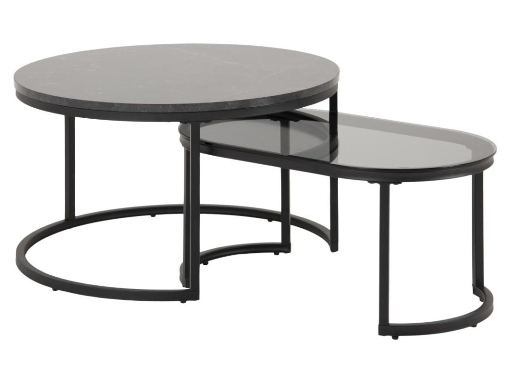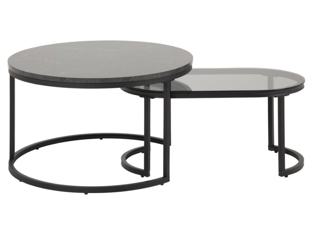 Kombinace kouřového skla a černého mramorového vzhledu dodává nábytku na eleganci a hluboké vizuální zajímavosti. Geometrická souhra kulatého a oválného tvaru vytváří harmonickou rovnováhu mezi symetrií a kreativitou. Černá práškově lakovaná ocelová základna podtrhuje industriální charakter a zároveň poskytuje pevnou oporu. Díky své flexibilitě lze stolky umístit samostatně nebo společně – podle potřeby prostoru.