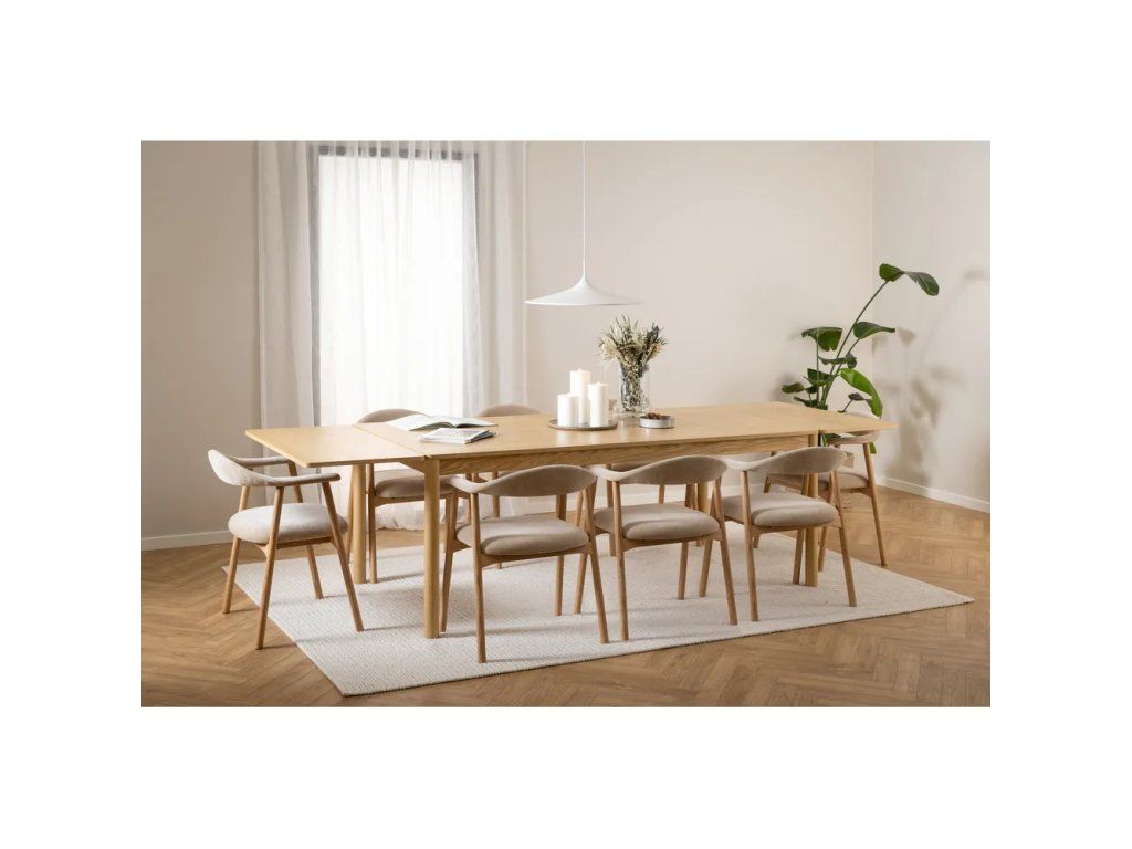 Barva Přírodní Počet osob Pro 6 Délka 200 cm Šířka 100 cm Výška 75 cm Váha 53.3 kg Nosnost 100 kg Výška nohou 66.2 cm Tvar Obdélníkový Tloušťka 1.8 cm Materiál desky stolu MDF Dekor Dub, matný Barva dřeva Světlé dřevo Povrchová úprava Dýha, lak Materiál nohou Masiv dub Barva nohou Světlé dřevo Rozkládací Ano Péče Čistit vlhkým hadříkem nebo houbičkou, nepouživat agresivní a abrazivní čističe Přídavná deska je součásti balení NeDoplňkové parametry