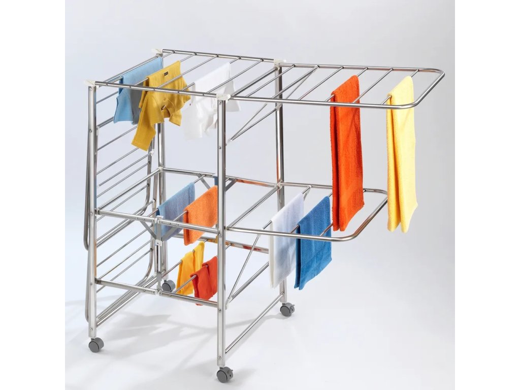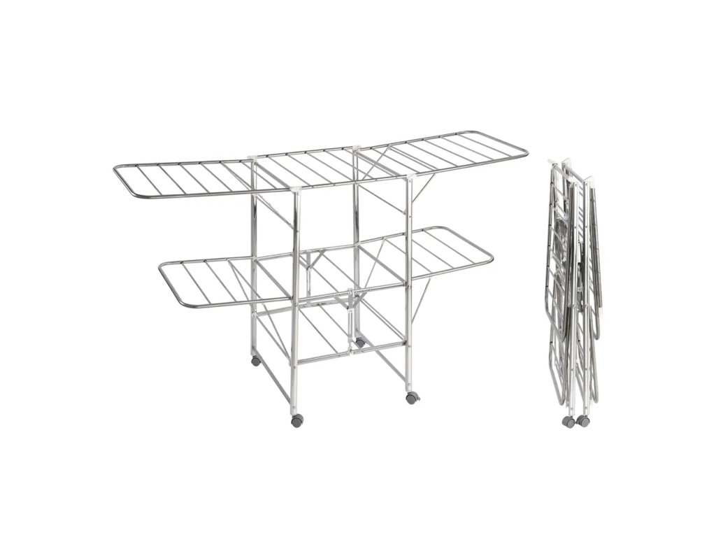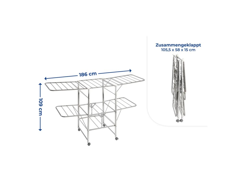 Barva Stříbrná Typ sušáku Stojací Délka 186 cm Šířka 109 cm Výška 58 cm Délka sušicí plochy 27 m Váha 5.052 kg Materiál Kov Specifický materiál Nerez Doplňkový materiál Plast Péče Otírejte vlhkým hadříkem