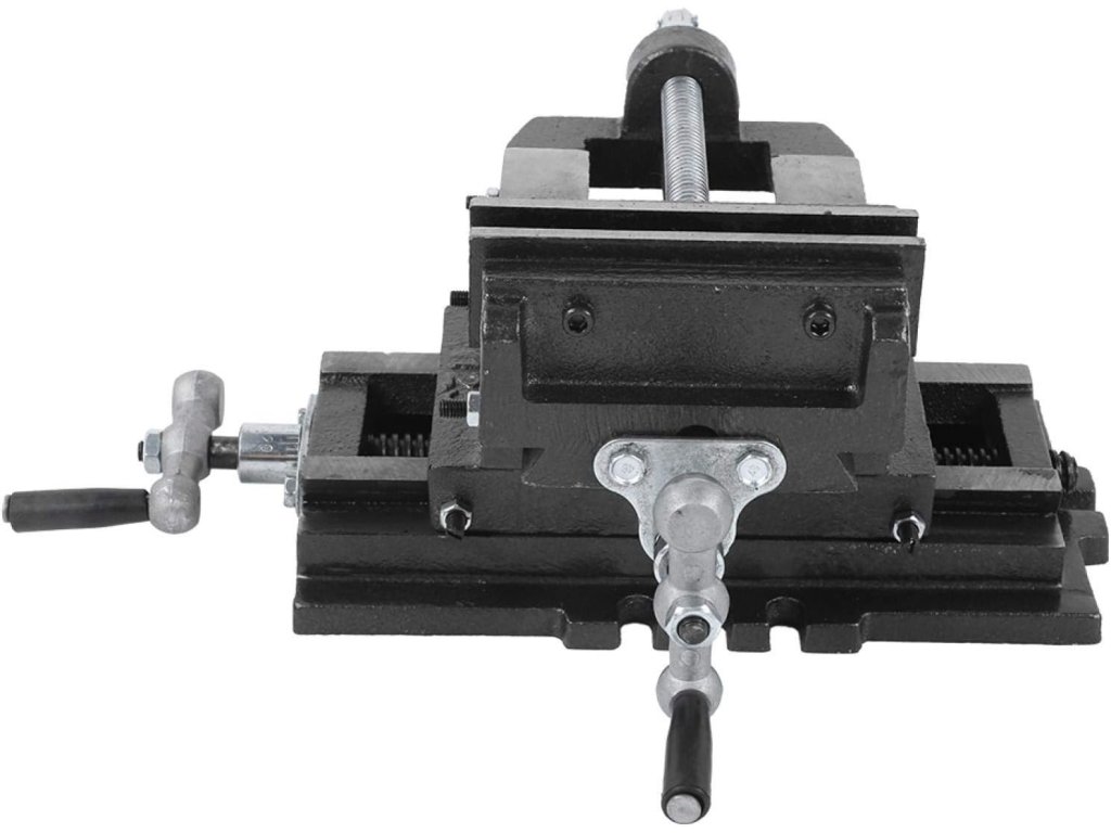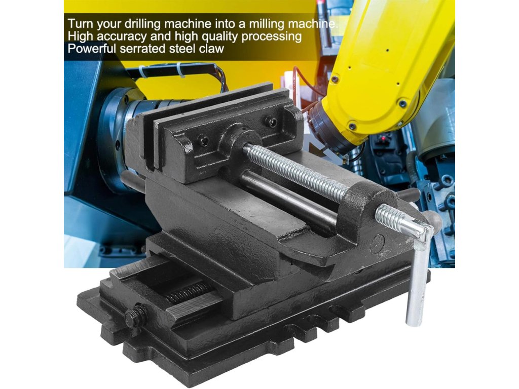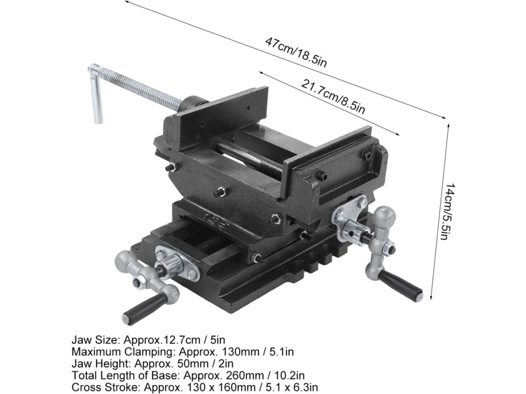 Obsah balení: 1× křížový strojní svěrák. Technické údaje: Výrobce: Ejoyous; Model: Ejoyousqgpzkmw5yh1387; Hmotnost: 10,44 kg; Materiál: litina; Barva: černá; Upínací šířka: 5 palců; Upevnění: šroubované drážky; Baterie: nejsou potřeba.