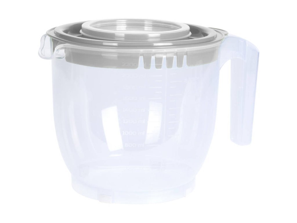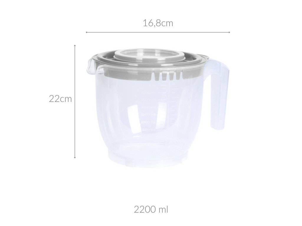 Mísa má objem 2200 ml, což poskytuje dostatek místa pro míchání větších porcí těsta nebo krémů. Je vybavena odměrkou, která usnadňuje přesné měření ingrediencí bez nutnosti použití dalších nádob.