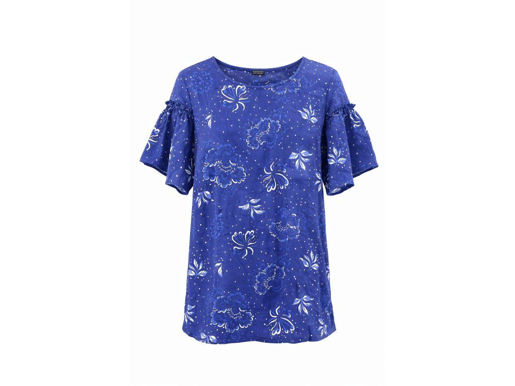 Specifikace: Halenkový střih s krátkým rukávem, vzorovaná přední strana s motivem listů, jednobarevná záda, materiál 100% viskoza, tmavě modrá barva, velikost XS.