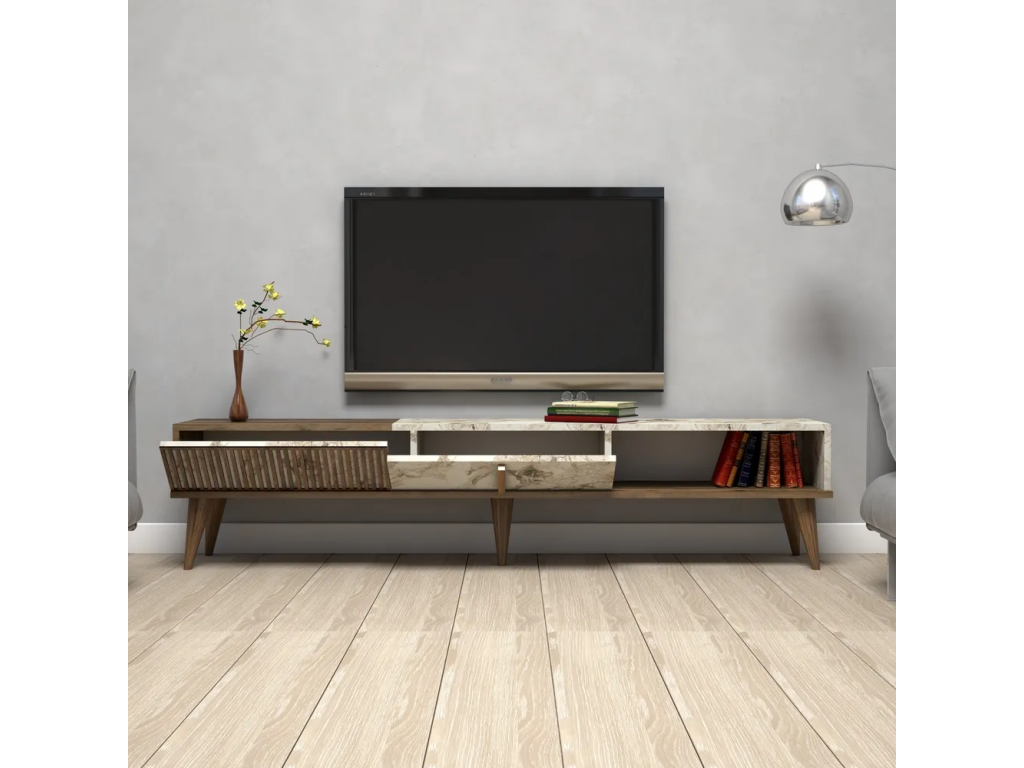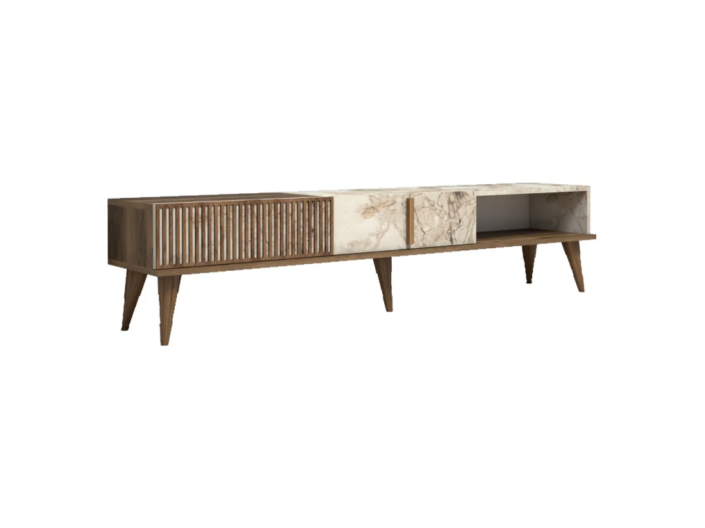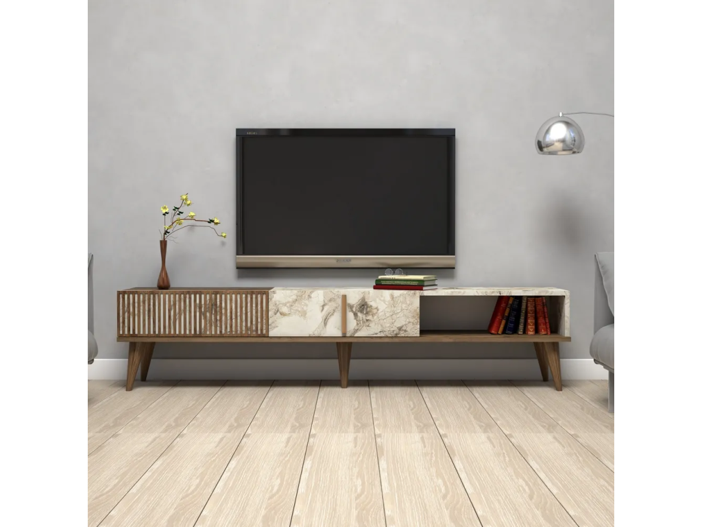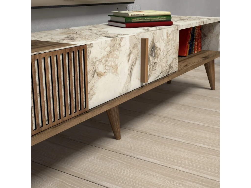 TV stolek Milan od značky Kalune Design je elegantní kus nábytku, který dokonale doplní váš obývací pokoj. Vyrobený z kvalitního MDF s melaminovou povrchovou úpravou v přírodní barvě s dekorem ořechu, který dodává interiéru teplo a přirozenost.
