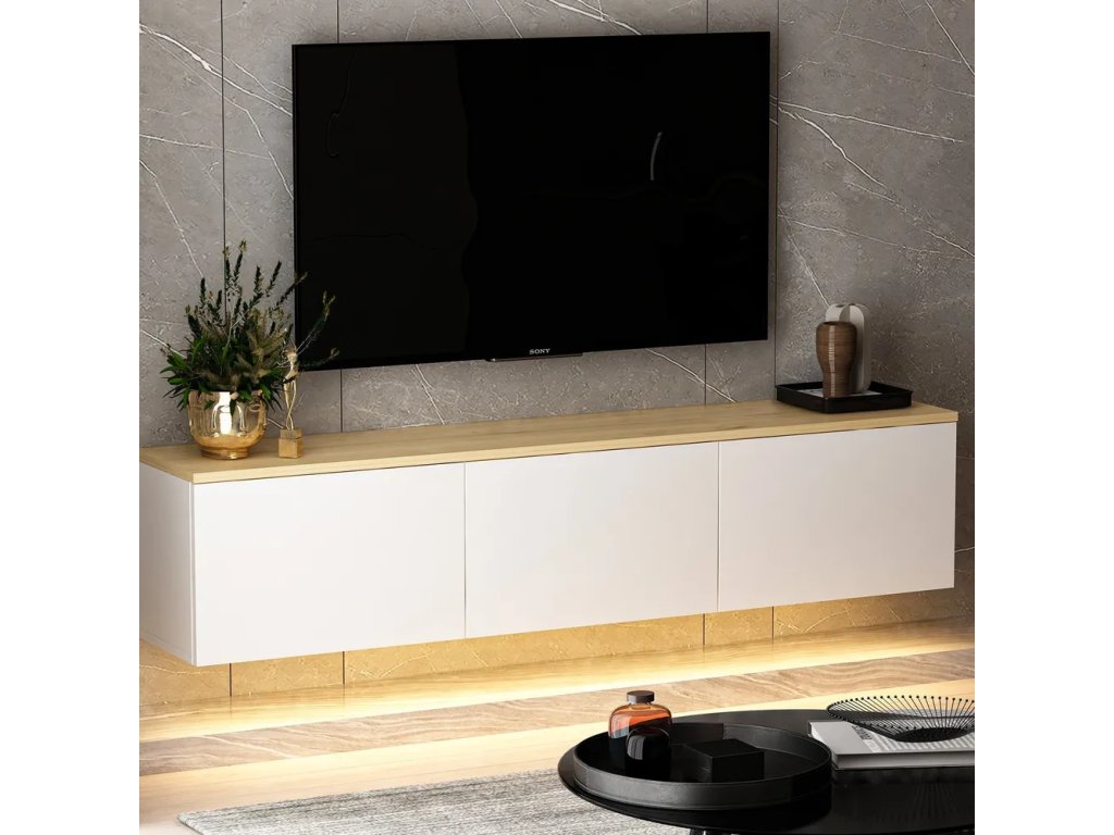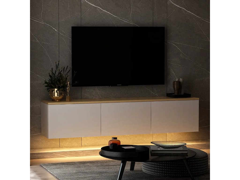 Dobré vědět: TV stolek je ze spodní strany opatřen LED páskou sálající teplé žluté světlo. Kabel disponuje klasickým adaptérem do zásuvky.