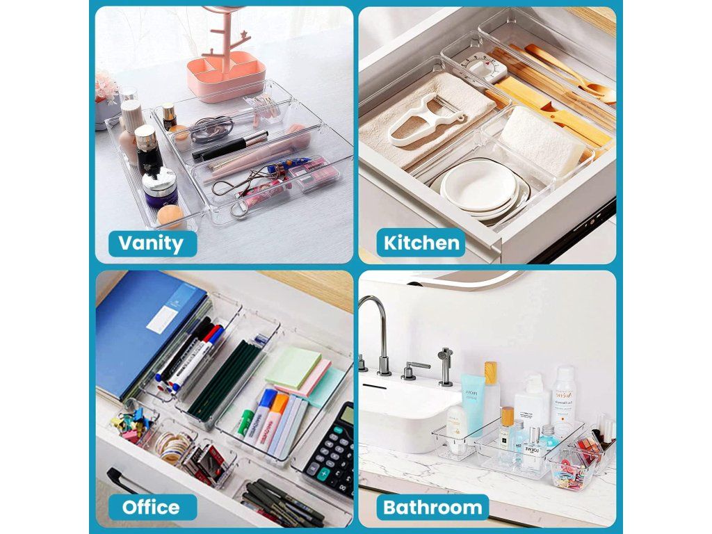 - Univerzální použití: Vhodné do toaletních stolků, koupelen, kuchyňských i kancelářských zásuvek, skvělé pro kosmetiku, make-up, vlasové doplňky, šperky, jehly, kancelářské potřeby nebo drobné nářadí.