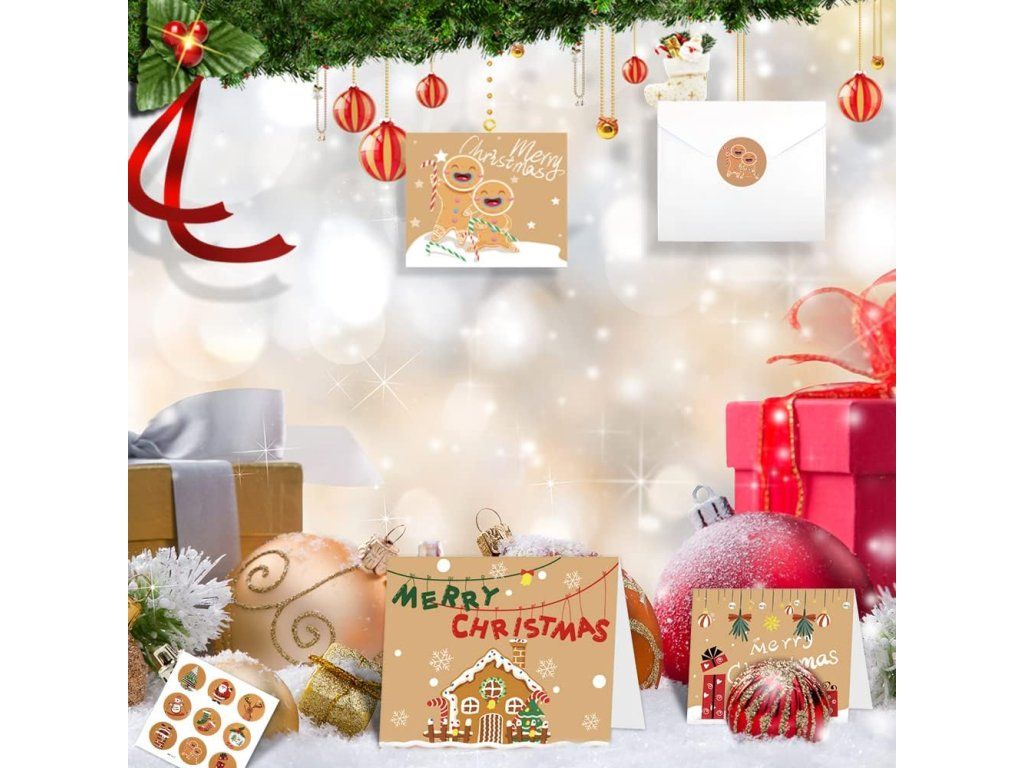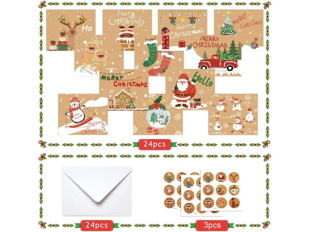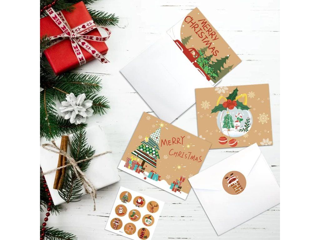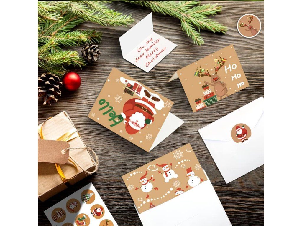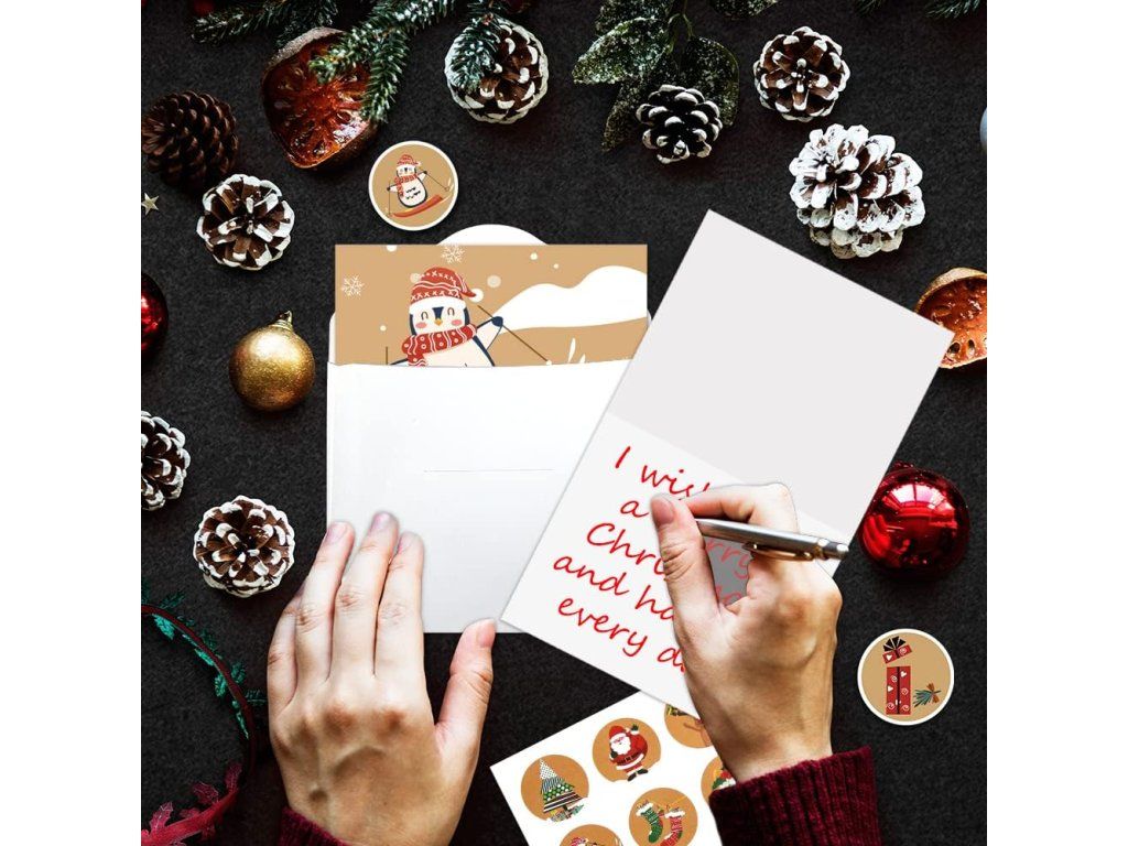 - Kompletní sada: 24 skládacích prázdných přání, 24 bílých obálek a 27 vánočních samolepek