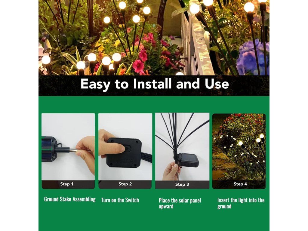 Použití je velmi jednoduché – stačí vložit solární světlo do zahrady, zapnout vypínač a nastavit preferovaný režim. Nejsou potřeba žádné kabely ani zástrčky, takže si můžete užívat nejkrásnější solární dekorativní světla na světě.