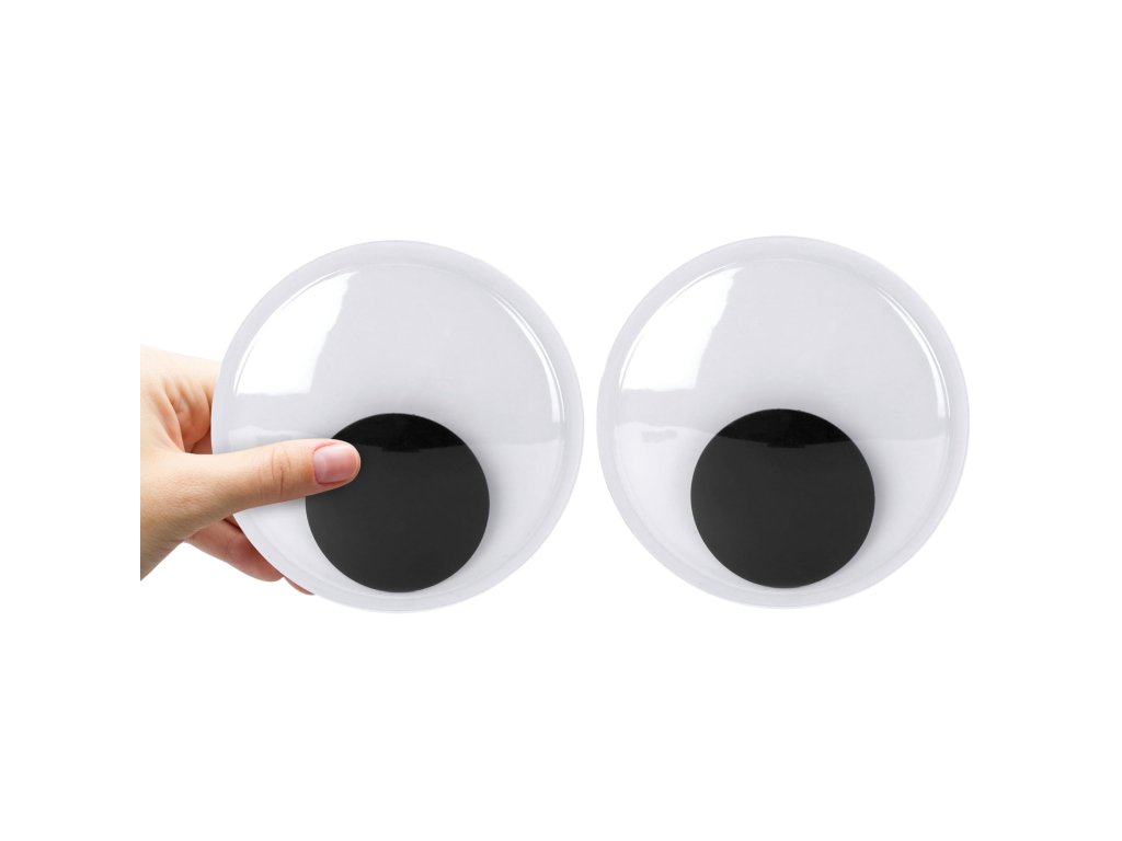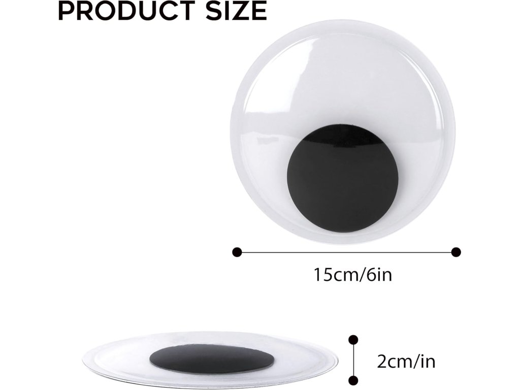 Obsah balení: 2 ks samolepících pohyblivých očí. Technické údaje: průměr 15,2 cm (6"), tloušťka přibližně 1,0 cm (0,39"), materiál plast, barva černá a bílá. Doporučeno pro vnitřní použití na hladké povrchy (např. plast).