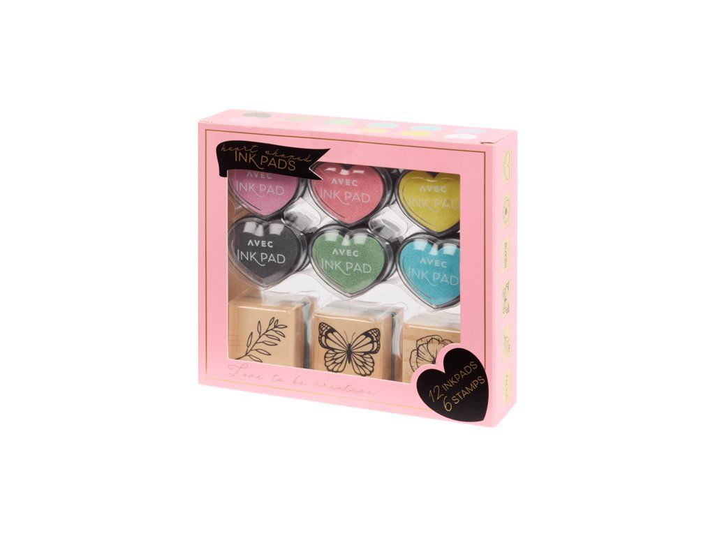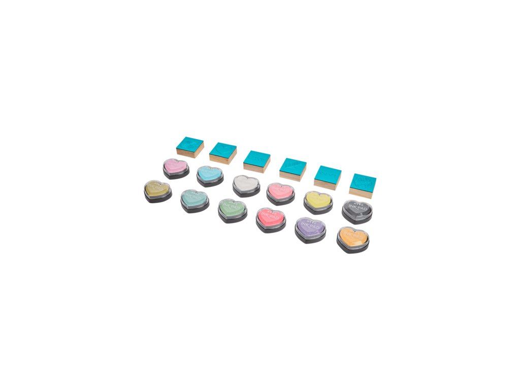 Vytváří ostré otisky. Sada obsahuje 12 inkoustových polštářků v různých barvách a 6 různých razítek. Razítkujte s touto fantastickou kompletní sadou plnou razítek a barev! Velikost razítek: 4x4 cm / Inkoustové polštářky ve tvaru srdce: 4x4 cm.