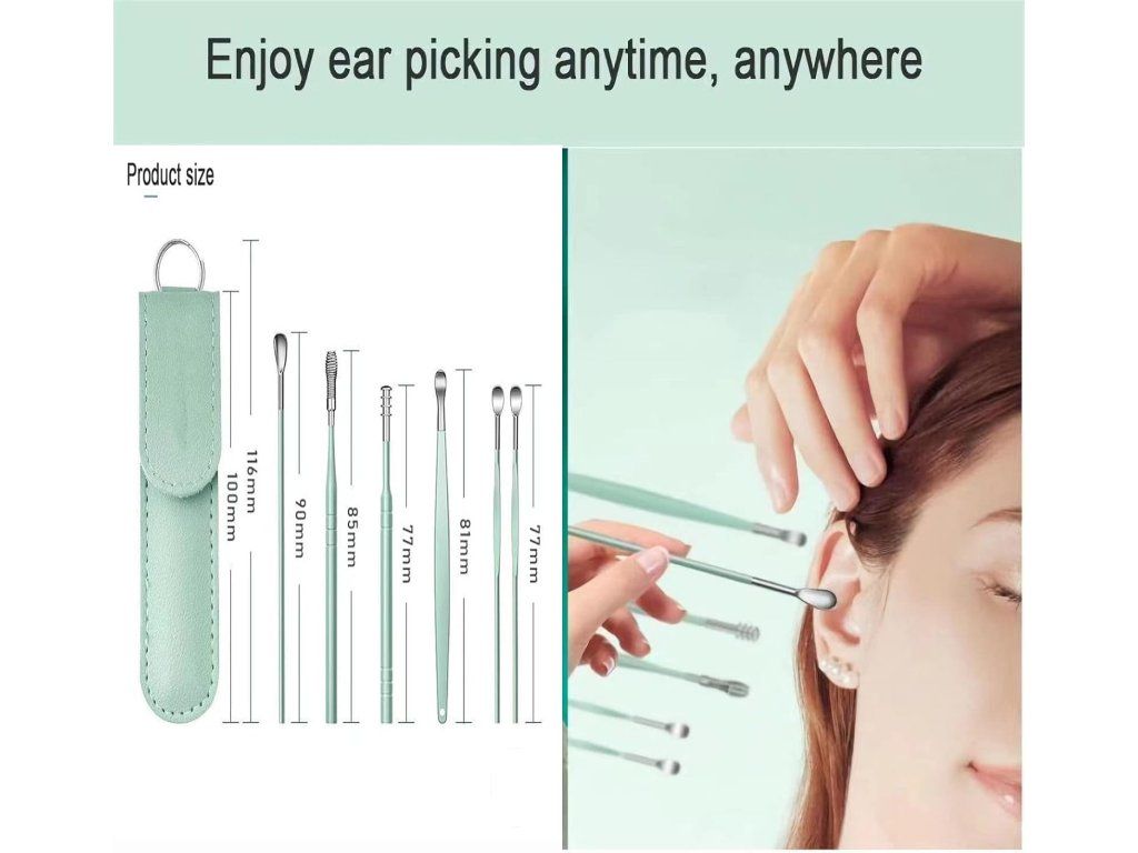 Obsah balení: 12 kusů nerezových nástrojů na čištění uší, 1 kožené přenosné pouzdro (barvy: modrá a zelená). Technické údaje: rozměry balení 5.63 × 4.02 × 0.67 in (cca 14,3 × 10,2 × 1,7 cm), hmotnost 1.76 oz (cca 50 g). Výrobce: Voitead. Dostupné od: 9. prosince 2022. ASIN: B0BX3GG6H1.