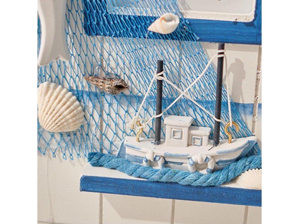 - Středomořský motiv: dekor s námořními prvky a ptákem přináší svěží plážovou atmosféru.